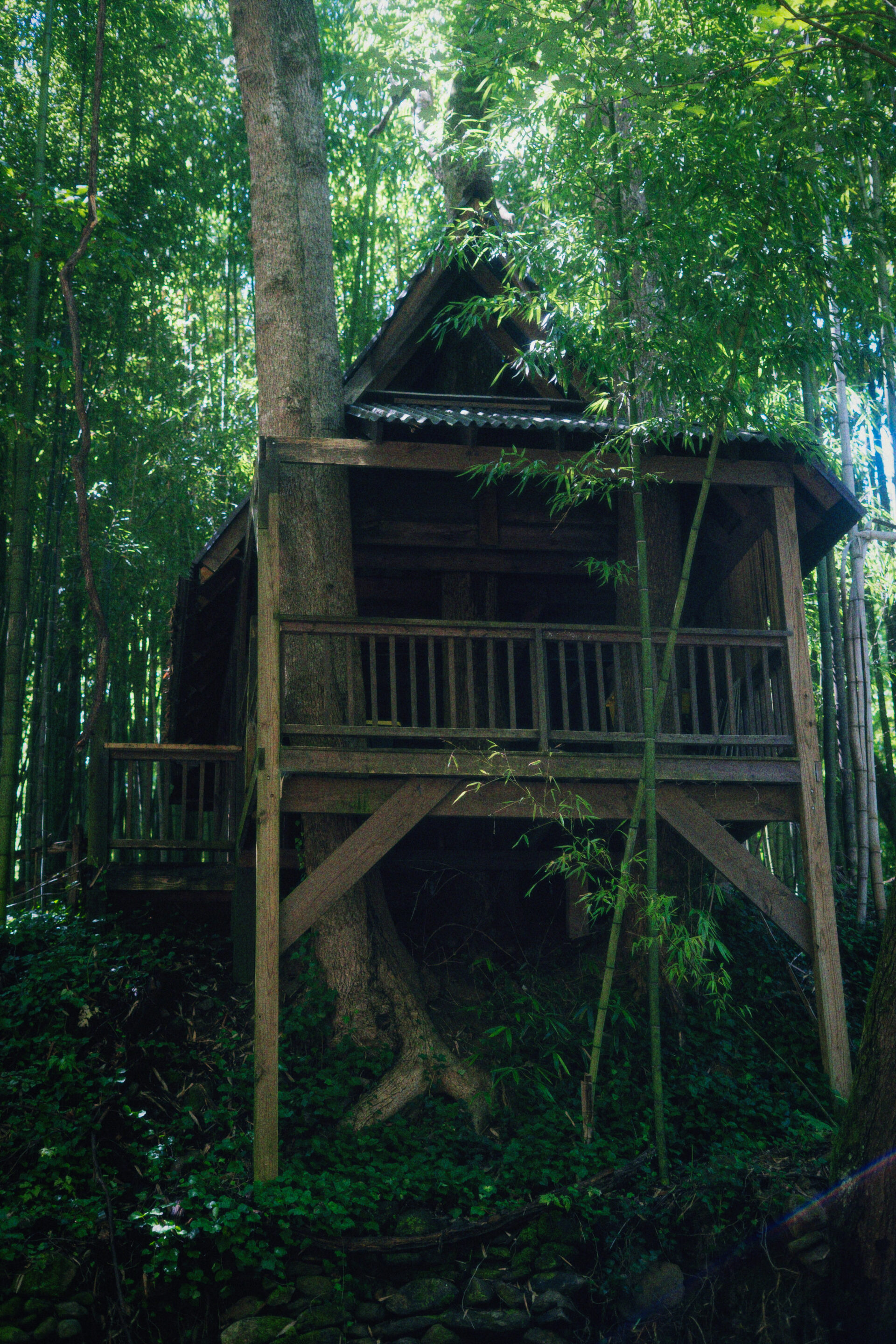 Half held by the earth, half cradled by the sky, our Treehouse is rustic elegance at its peak. Enter at ground level to a four-poster bed framed by glass walls that open to a deck wrapped around three trees, high above the creek. A ladder leads to a loft with two twin mattresses, where night whispers drift through the branches. Equipped with electricity, a heater, and a small fridge, this hideaway is beloved by those who want to dream among the leaves.